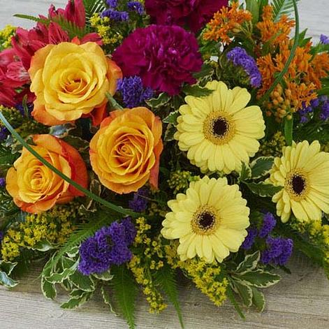 A vibrant posy featuring germini, roses, carnations and alstroemeria in rich shades.