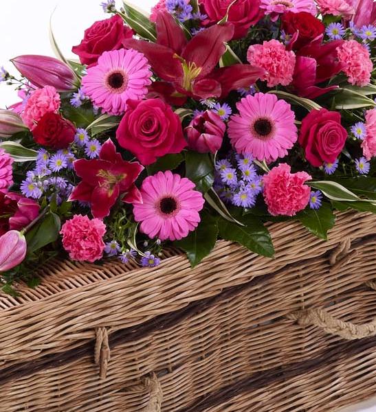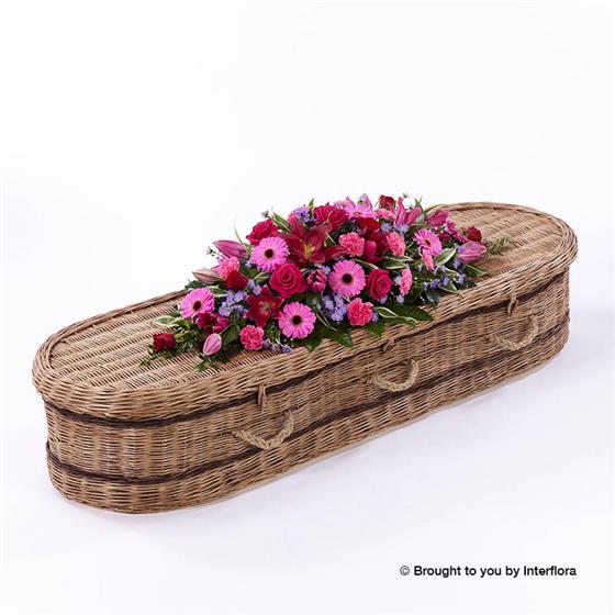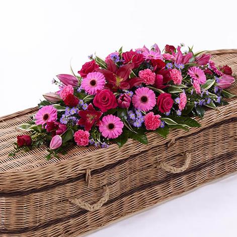 This bright casket spray feautring a classic selection of flowers in pink, red and lilac includes large-headed Rose, carnations, Gerbera and Oriental Lily complemented by luxurious foliages.