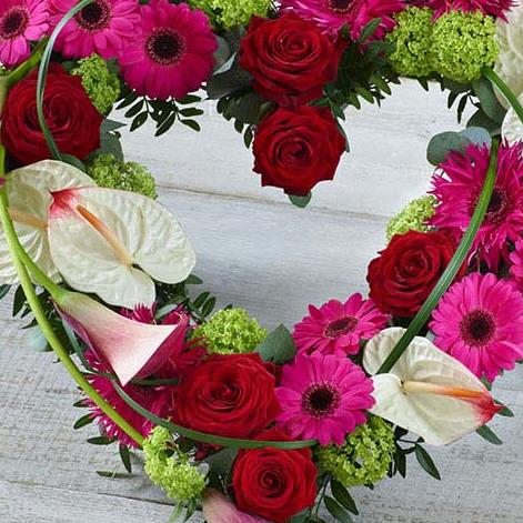 A vibrant contemporary heart tribute featuring striking anthurium and calla lilies in an open heart design.
