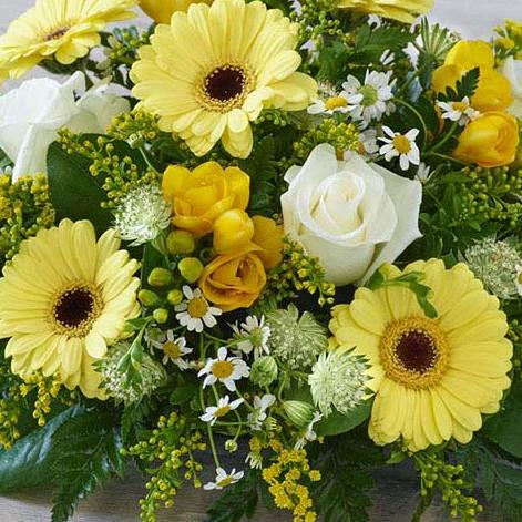 A pretty combination of fresh yellow and white blooms featuring germini, astrantia and fragrant freesias.